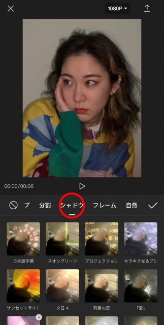 ④エフェクトの中の「シャドウ」を選択して、お好みのものを選んでください