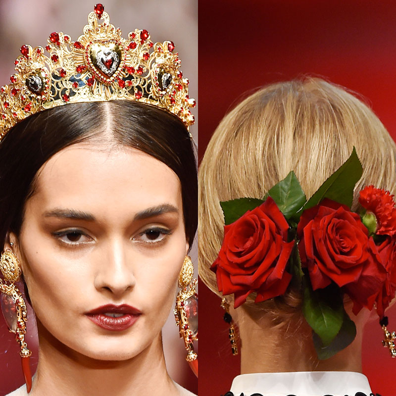S/S can be very pop and colorful, or pale and fancy, but D&G took a shot for edgy, gorgeous, profound collection which really, in my personal opinion, stood out this season. I love, love, loved it. You can see many heart designs, but because it only uses gold, black and red for most of the looks, they don’t look too lovely and pretty-pretty but instead very chic and mode. I loved this crown and the hair style on the right, with roses.