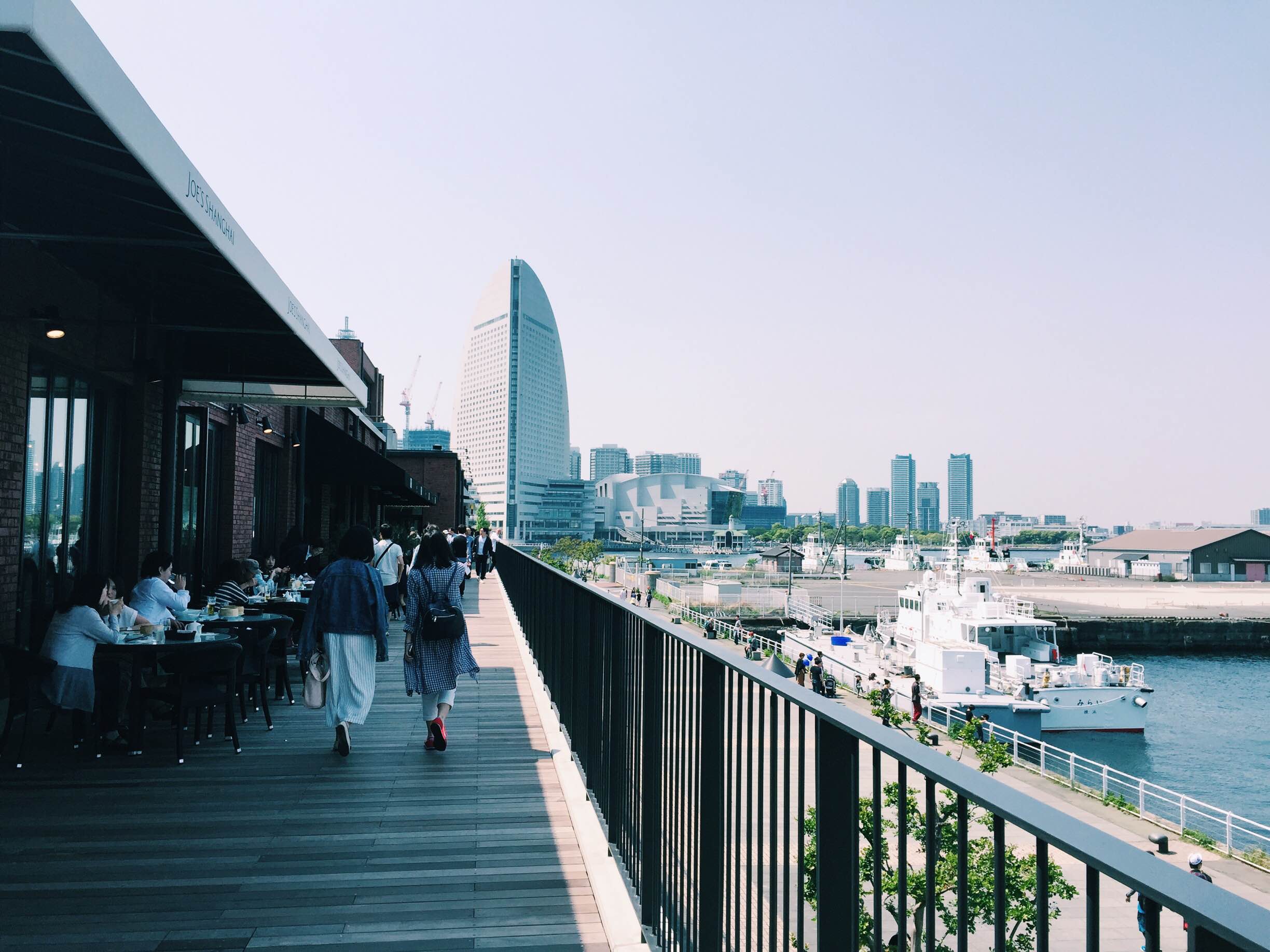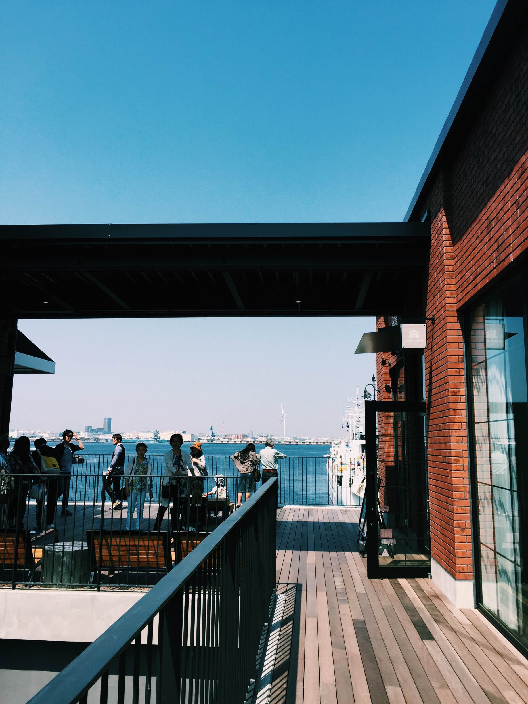 Upstairs is the wood deck, and there are restaurants/cafes where you can eat and have a drink by the beautiful scenery of Yokokohama bay.