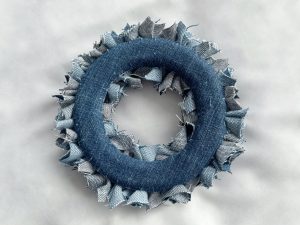 背面を隠したい方は先にリースのサイズに合わせてドーナツ状に生地を切り、周りと中の穴に切れ込みを入れ、接着剤を塗って貼り付けます。