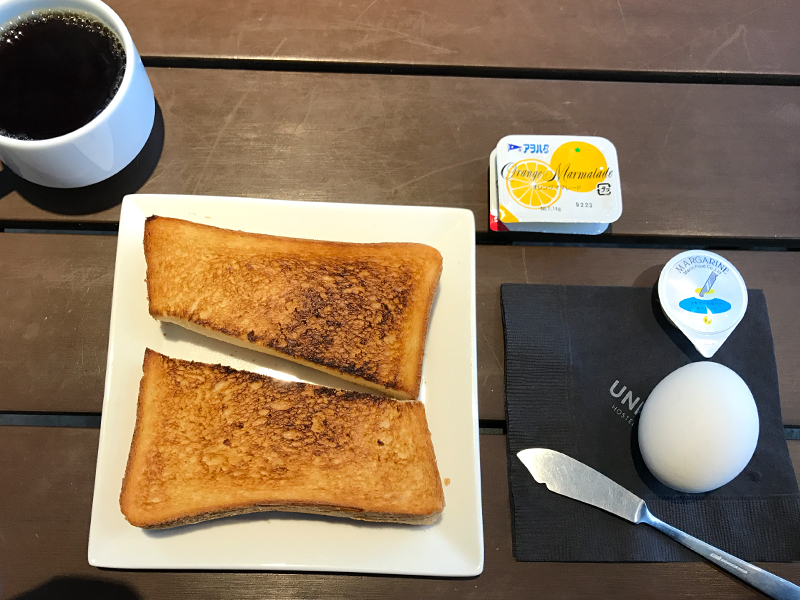 嬉しいのが、宿泊者にはAM8:00~AM10:00の間、無料で厚切りトースト・ゆで卵・ドリンクがついてくる朝食サービス。