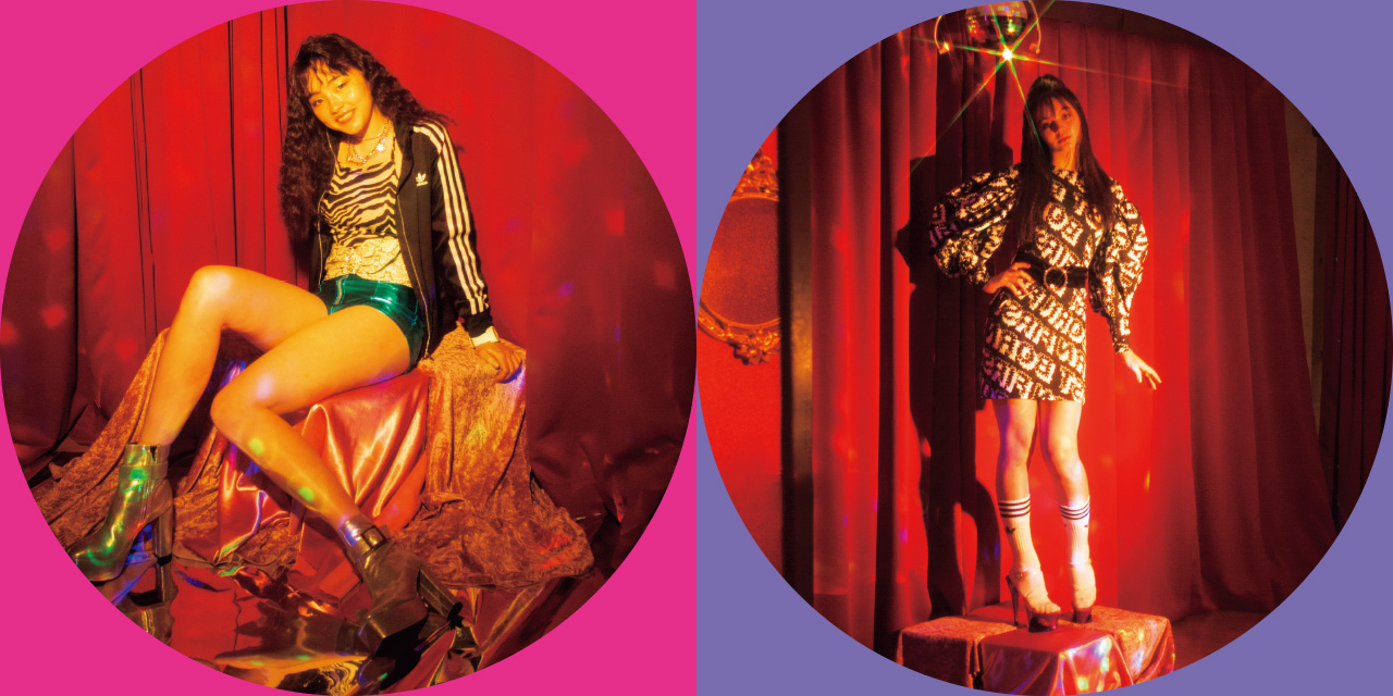 全面に施した煌びやかなスパンコールと、ユニフォームやジャージを合わせた着こなしでストリートマインドを感じるNEW DISCOスタイルが完成。