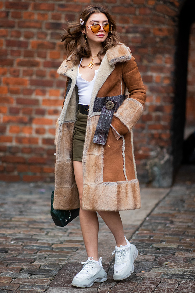 90’sムード漂うカジュアルなスタイルにヴィンテージライクなムートンコートを合わせたコーディネイトは時代を超えたカルチャーミックスさがおしゃれ。メガネチェー付きのサングラスも遊び心があって効果的。