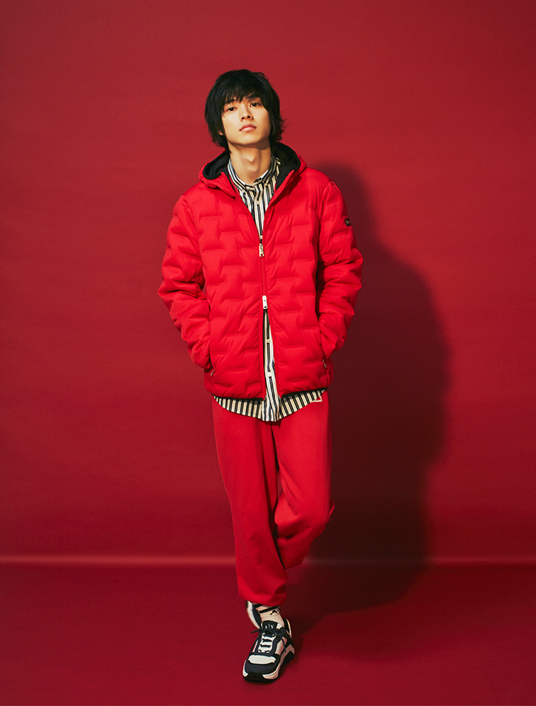 赤がもたらすファッションへの勇気とは アイデンティティを切り開いてくれるのは、赤のコーデ。レディース展開もあるダウンブルゾンを主役にスウェットパンツを合わせ、シャツをインナーにすることでラフに振りすぎないのが鍵。ソックスのロゴを見せつけて、さらに自分らしいアレンジを。 down blouson¥44,500 shirt¥14,600 pants¥18,800 socks¥3,200*2 set price sneakers¥22,200 all by a|x armani exchange/giorgio armani japan |
