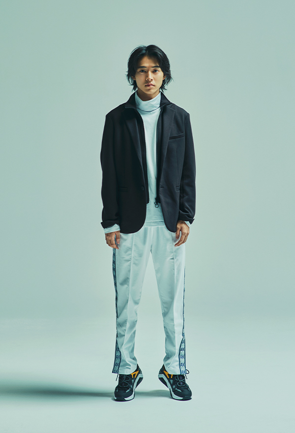 タートルネックが好きなので、白いタートルネックのカットソーが気に入りましたね。リフレクターのブルゾンはインパクトがあったし、撮影の時は少し暑かったですが、冬は暖かくて頼りになると思います。あとはやっぱりラフに着られるジャージーのようなイージーパンツですね。ジャージー素材のジャケットは、カチッとした印象にしたい時にも着られるのに、すごく着心地が良くて、いいなって。普段はスニーカーを履くので、そこに合わせやすいものに目がいくのかもしれません。