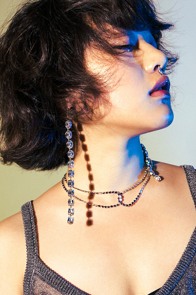 セプタムピアス¥11,000(Bijou R.I/ビジューアールアイ)、チョーカー¥2,900(EMODA/エモダ ルミネエスト新宿店)