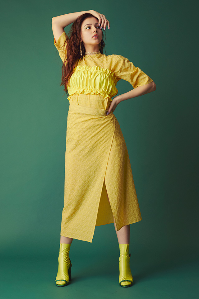 シャツ¥35,000、スカート¥33,000(共にMMA/エム)、ブラトップ¥26,000、ソックス¥6,900(共に5-knot/エスティーム プレス)、ピアス¥9,500(somnium/ソムニウム)、チョーカー¥1,000(GALLERIE TOKYO/ギャレリー)、シューズ¥14,800(YELLO/イエロ)