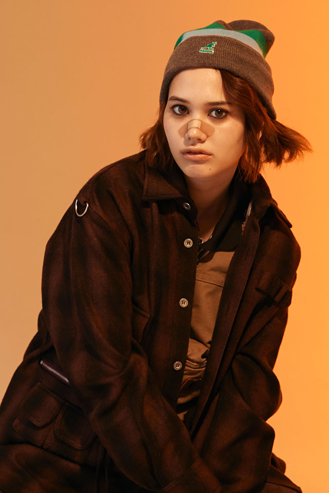 ジャケット¥7,300(FAITH/フェイス)、ベスト¥9,990(Vintage/バニー)、ポロシャツ¥〇〇〇〇(R.M GANG/ピールピーアール)、パンツ¥27,800(HOLIDAY/ホリデイ)、ニット帽¥4,300(KANGOL/カンゴール ヘッドウェア)、グローヴ¥26,000(YuumiARIA/アリア)、ブーツ¥25,000(Timberland/ティンバーランド/VFジャパン)