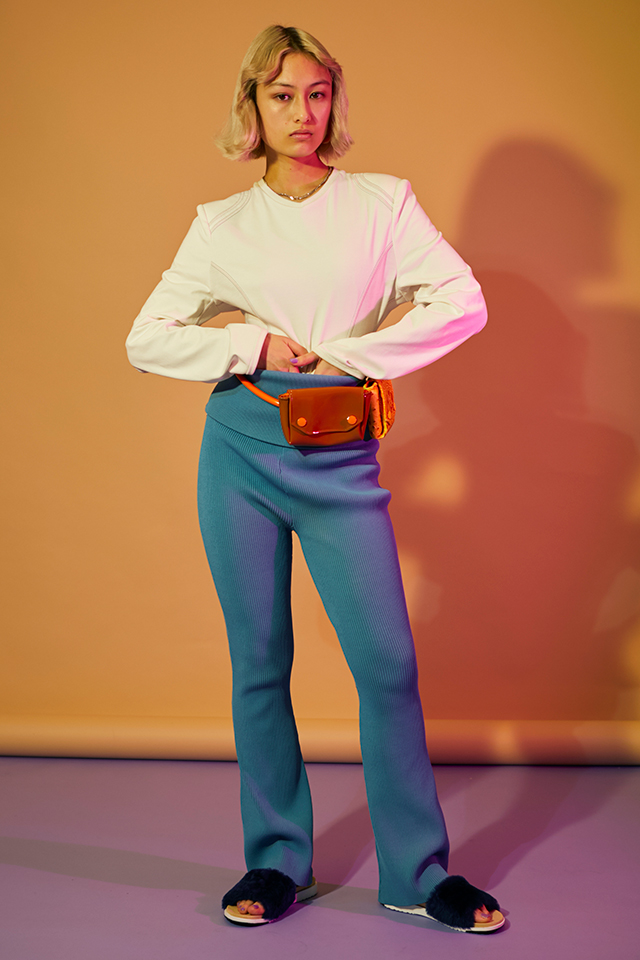 トップス¥30,800(SIRLOIN)、パンツ¥25,000(LEINWÄNDE/共にエムエイティティ)、ピアス¥11,000(Bijou R.I/ビジュー アール・アイ)、ウエストポーチ¥26,000(5-knot/エスティーム プレス)、サンダル¥12,000(EMU Australia/ワイズサーフ)、ネックレス スタイリスト私物
