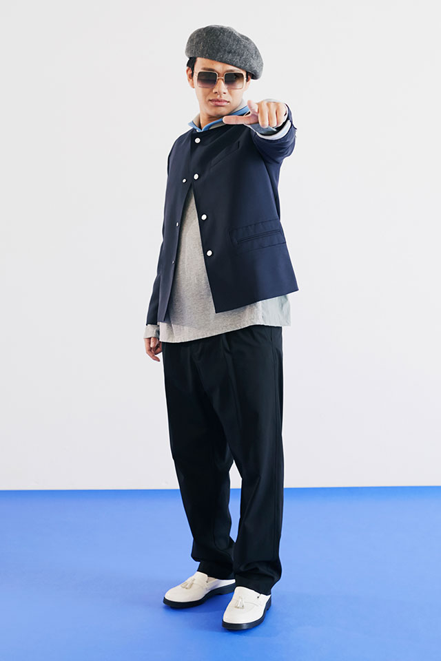 ジャケット¥65,000(Kazuki Nagayama/インシデンツ)、中に着たトップス¥2,000(United Atthle/キャプ)、ボトムス¥32,000(Munsingwear/マンシングウェア クラブハウス 銀座)、ハット¥7,900(HARIM/スタジオ ファブワーク)、サングラス¥47,000(Mr.GentlemanEYEWEAR/ジョイ エブリ タイム)、シューズ¥32,500(BLOHM/スタジオ ファブワーク)