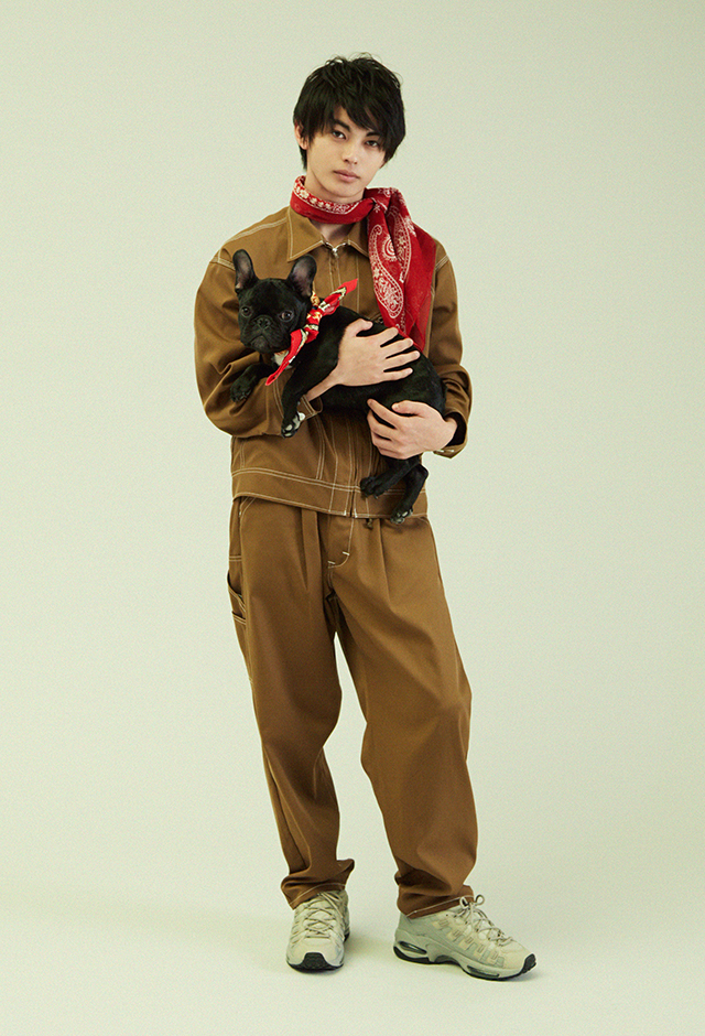 トップス¥14,800、パンツ¥11,500(共にLee×BEAMS/ビームス 原宿)、スカーフ¥10,000(NEEDLES/ネペンテス)、シューズ¥16,000(PUMA/プーマ お客様サービス)