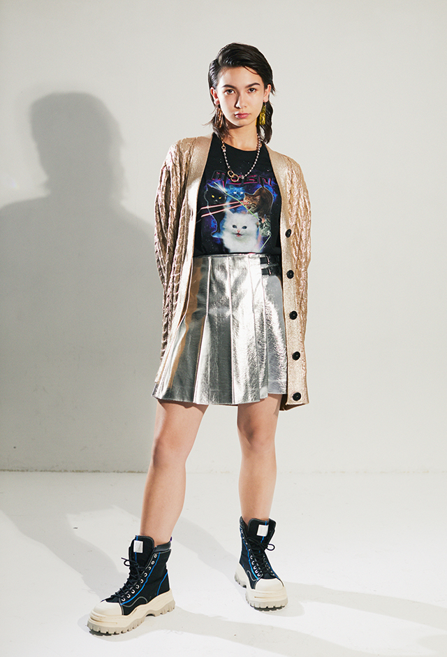 カーディガン¥100,000、トップス¥27,000、スカート¥59,000(全て MSGM/アオイ)、ピアス¥17,750(MONDAY EDITION/ジェムプロジェクター)、ネックレス¥11,000(Bijou R.I/ビジュー アール・アイ)、シューズ¥42,750(EYTYS/エドストローム オフィス)