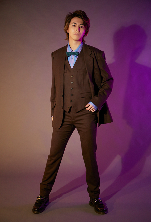 ジャケット¥77,000、ベスト¥30,000、シャツ¥34,000、パンツ¥34,000(全て LITTLEBIG/リトルビッグ)、蝶ネクタイ¥9,000(A(LeFRUDE)E/シアン PR)、ローファー¥23,000(Dr.Martens/ドクターマーチン・エアウエア ジャパン)