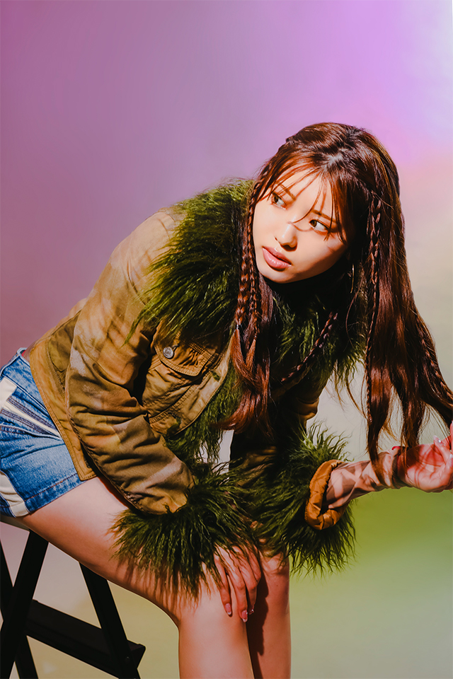 ジャケット ¥61,600、インナーに着たトップス ¥30,800、スカート ¥31,900(全てDIESEL/ディーゼル ジャパン)、シューズ ¥26,400(Timberland/VF ジャパン)、イヤリング ¥22,000(critical:lab/ピーアールワントーキョー)、ネックレス ¥90,200(flake/フレーク)
