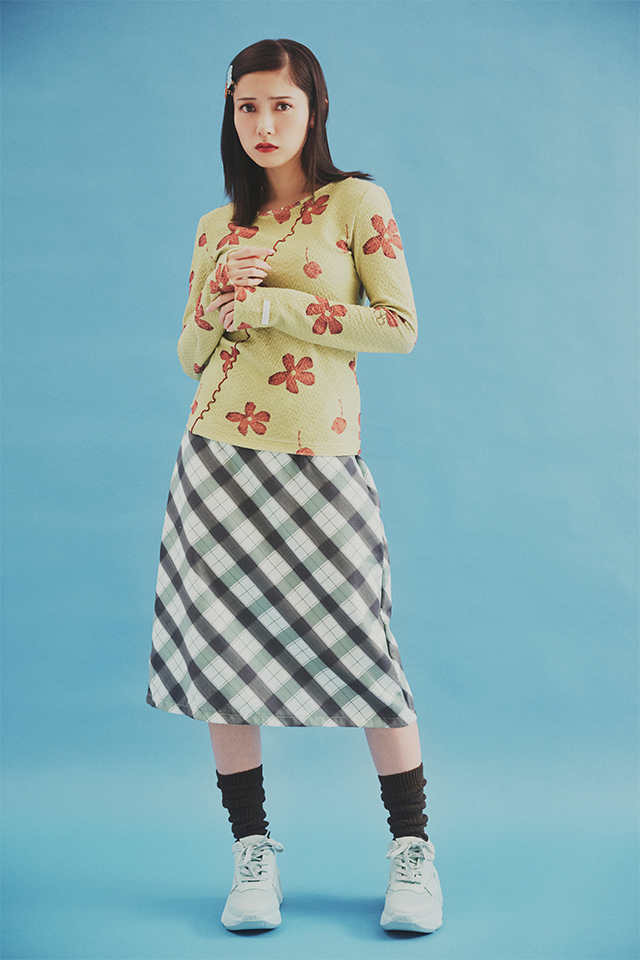 トップス¥6,454(KIRSH/ムシンサ グローバル ジャパン)、スカート¥4,390(nadia flores enel corazon)、スニーカー¥49,500(UNITED NUDE/M incorporated)、ソックス¥3,500(Mardi Mercredi/マルディメクルディジャパン)、ヘアアクセサリー(ブラウン)¥1,100、ヘアアクセサリー(ブルー)¥1,100(キャップTURE C/スクリーンショット)