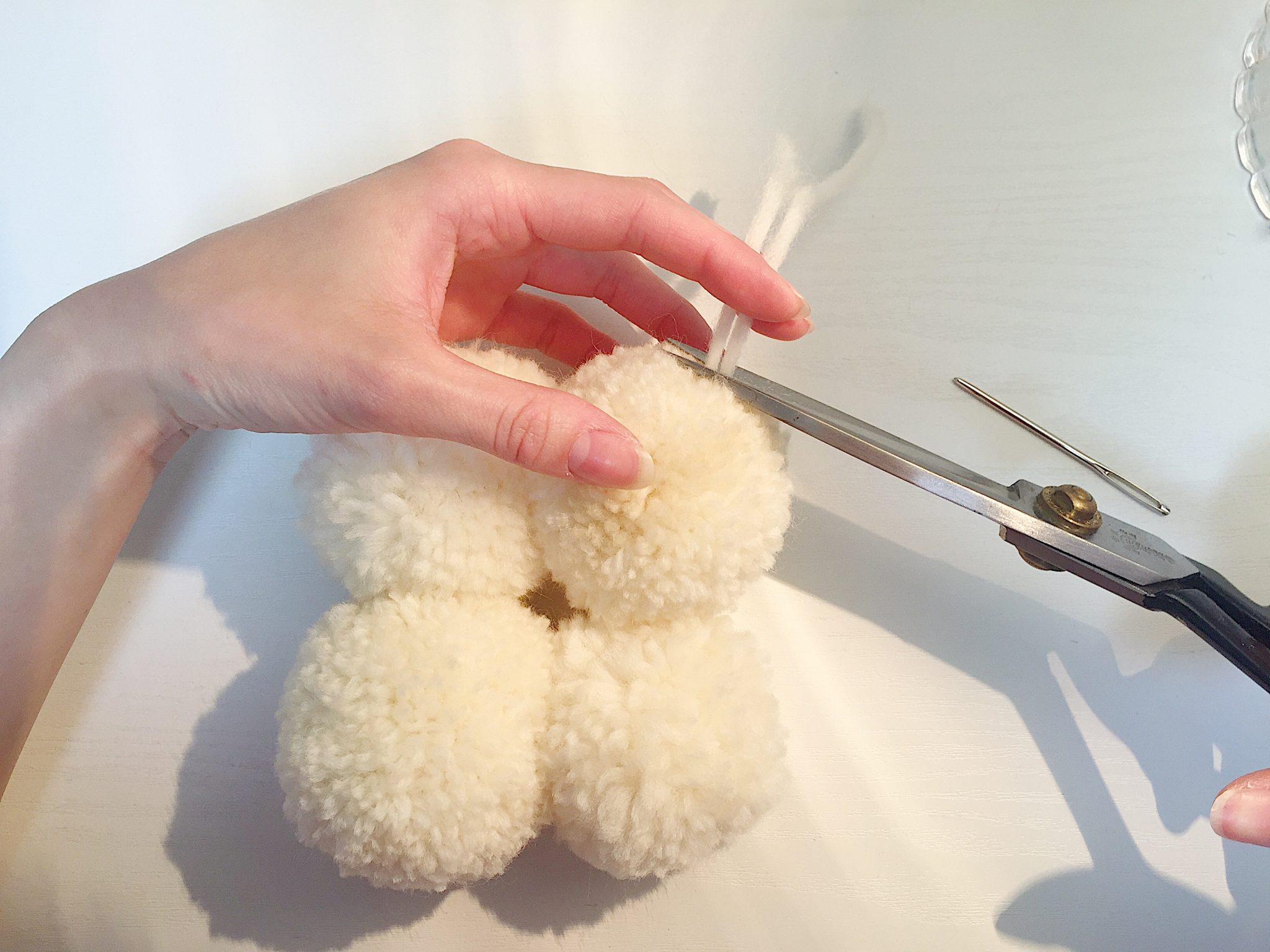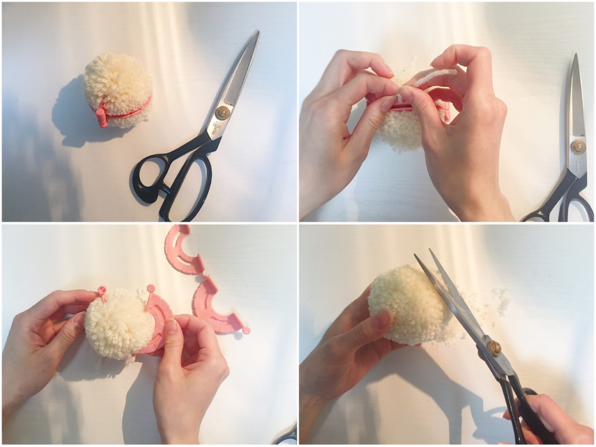 カットしたら毛糸で結んでポンポンメーカーを外します