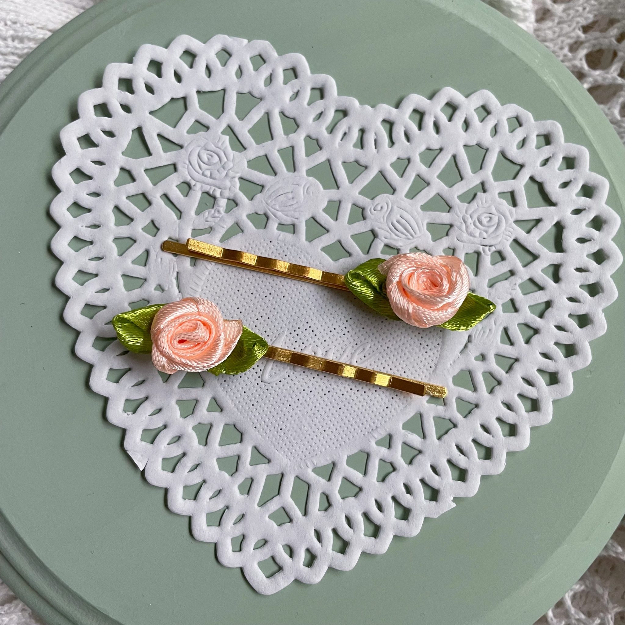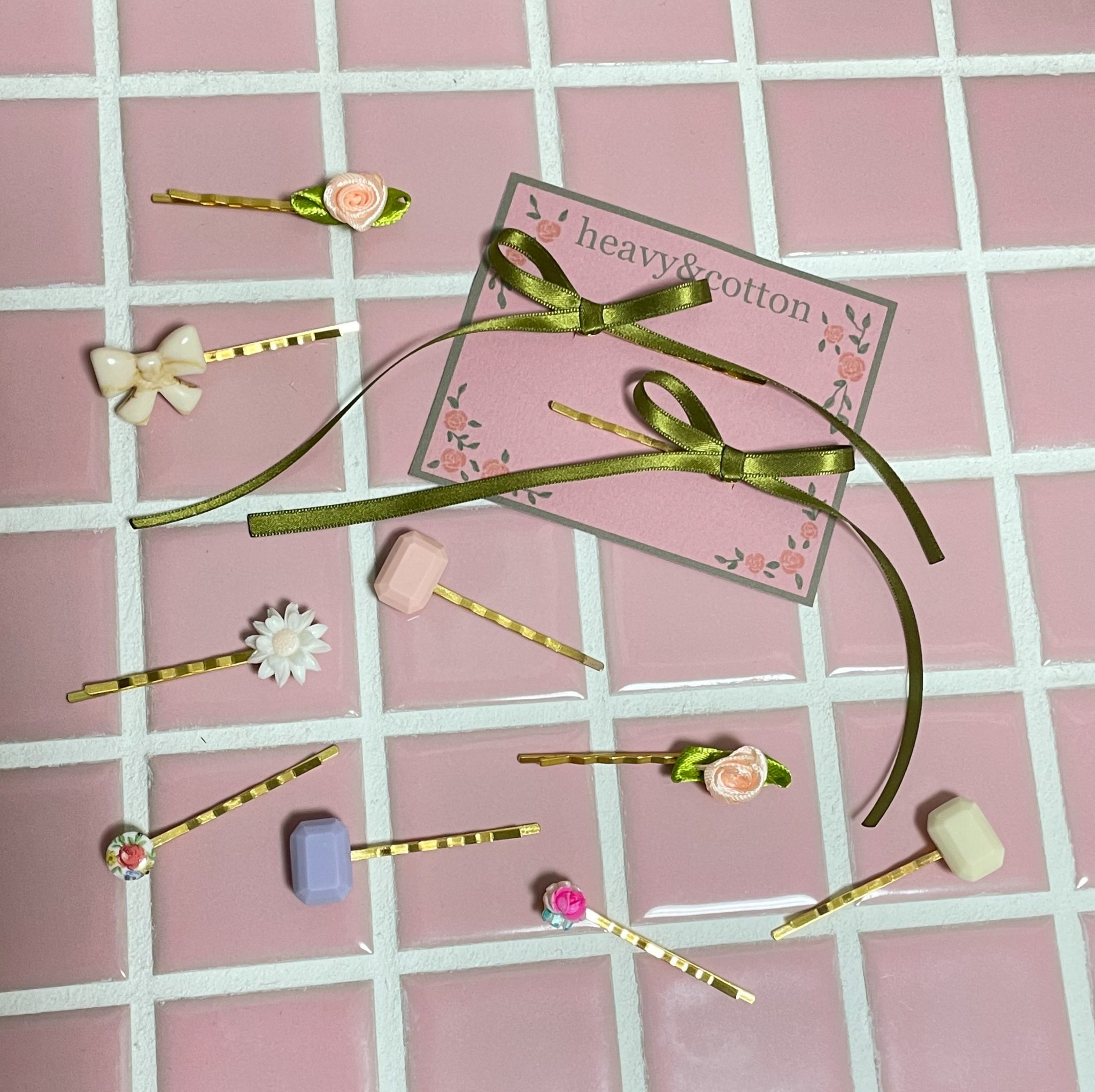 コレクションしていたヴィンテージのパーツを使用したヘアピンと最近好きなオリーブカラーのリボンとローズモチーフのヘアピン