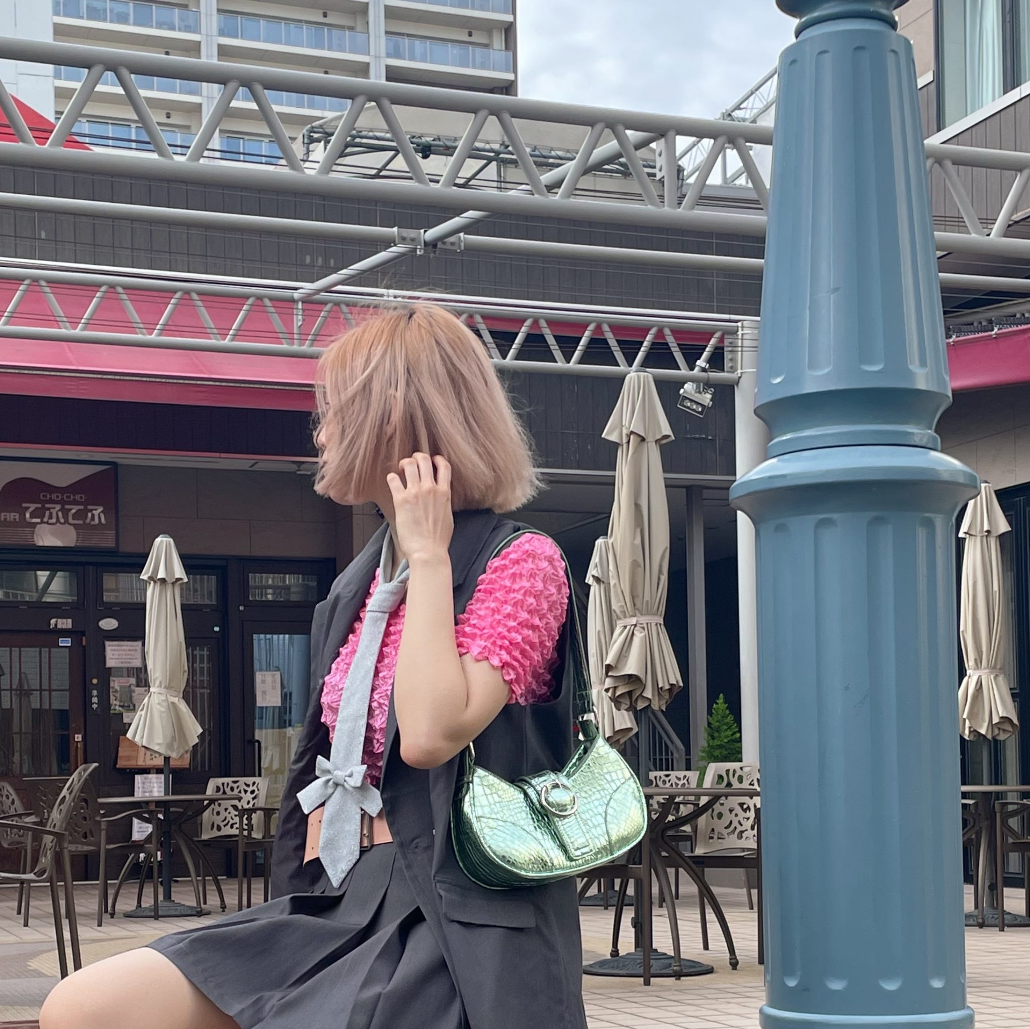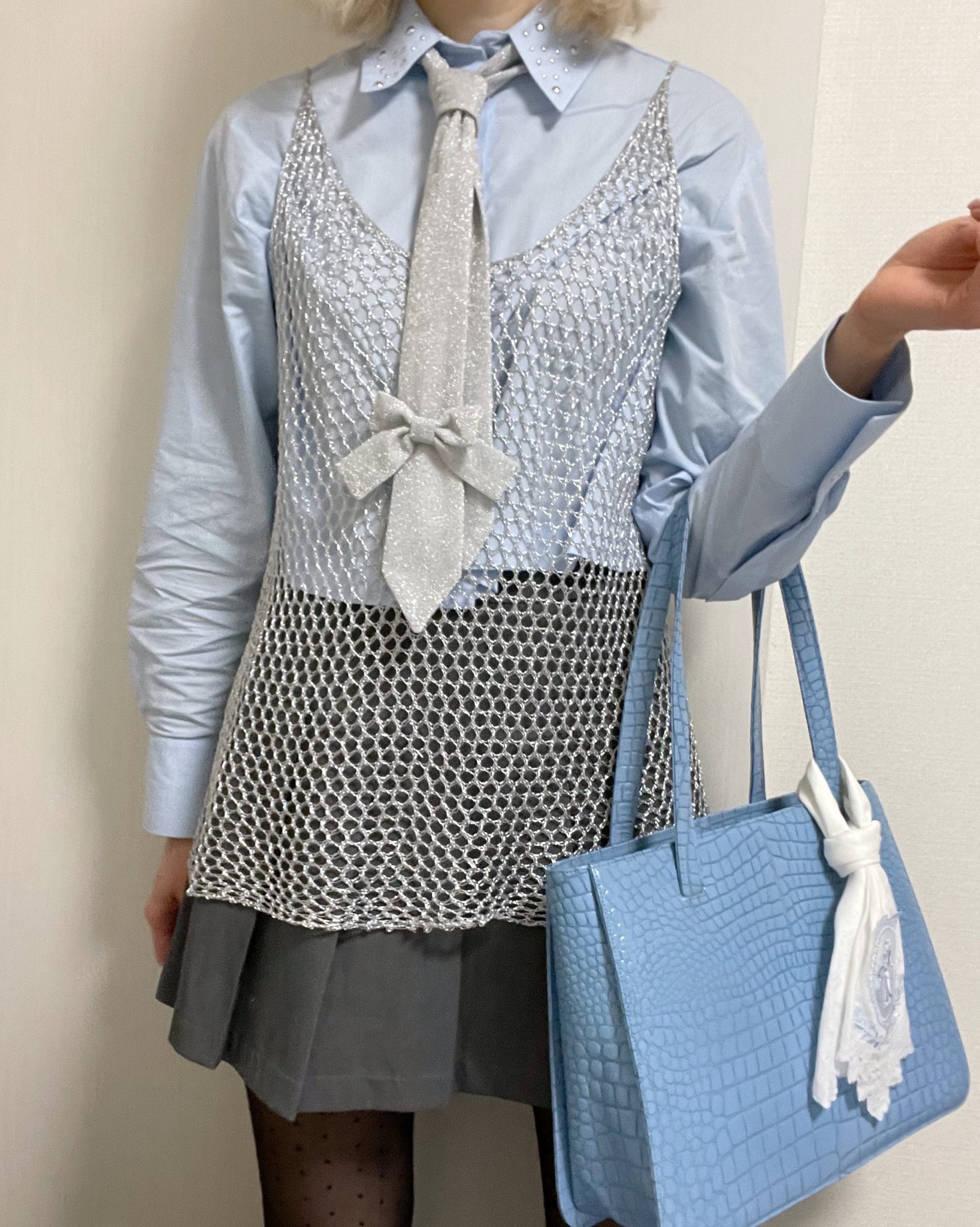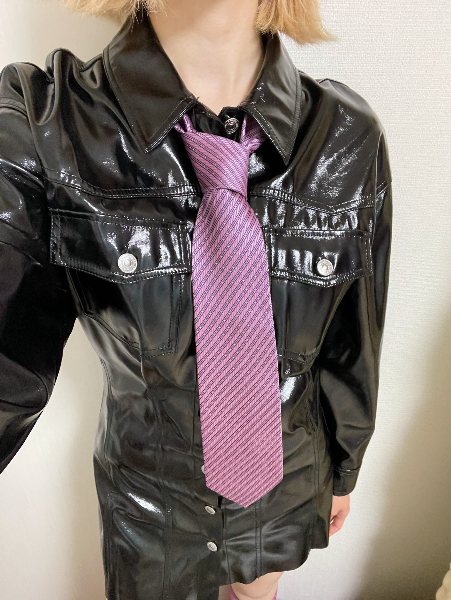 エナメルのワンピースもネクタイをプラスするだけで雰囲気が全然違う