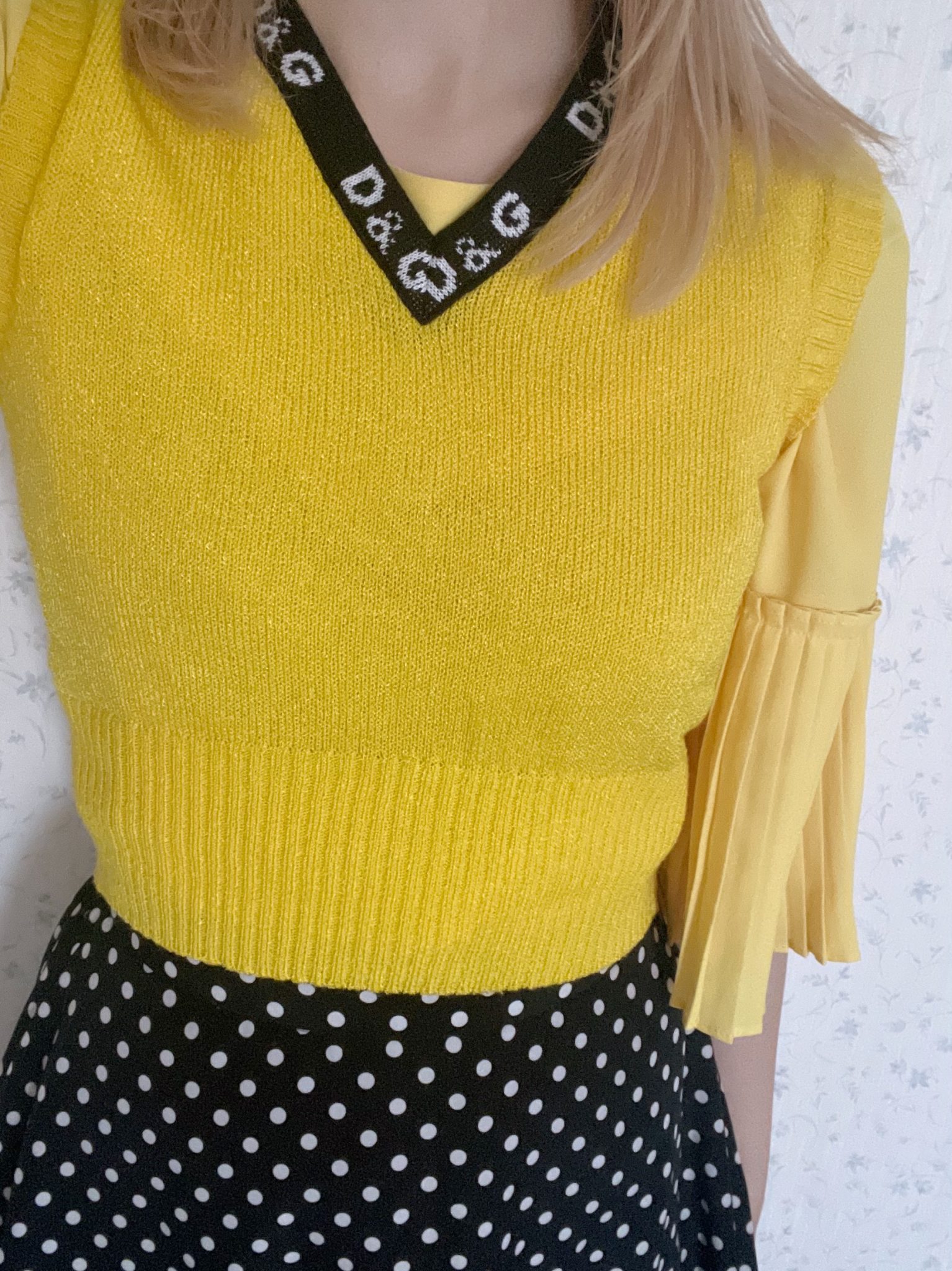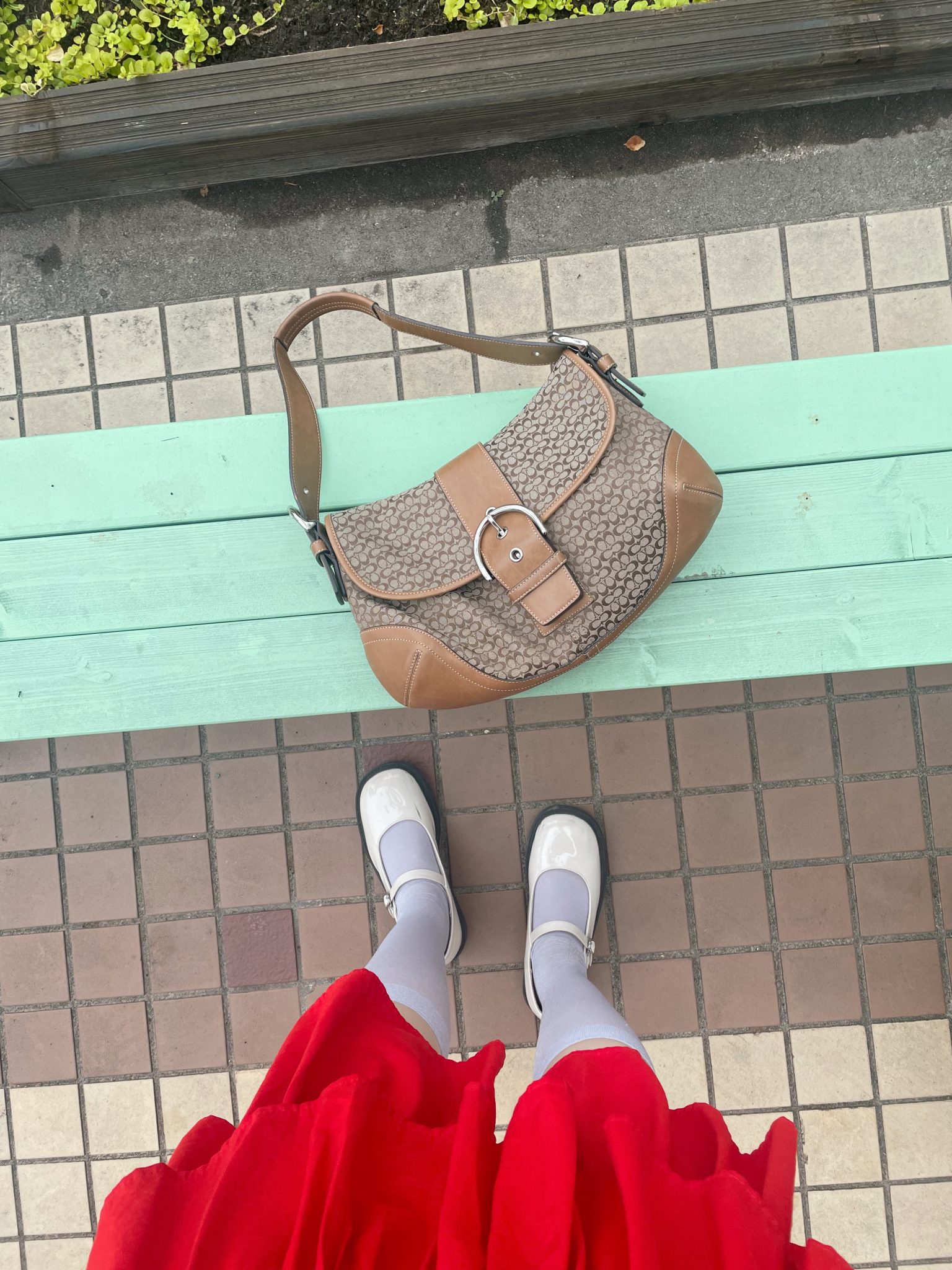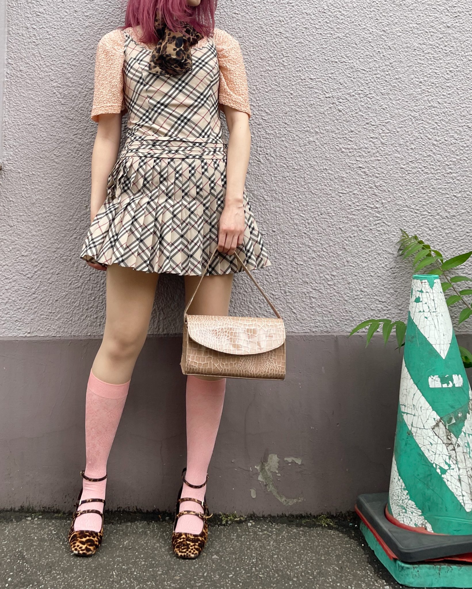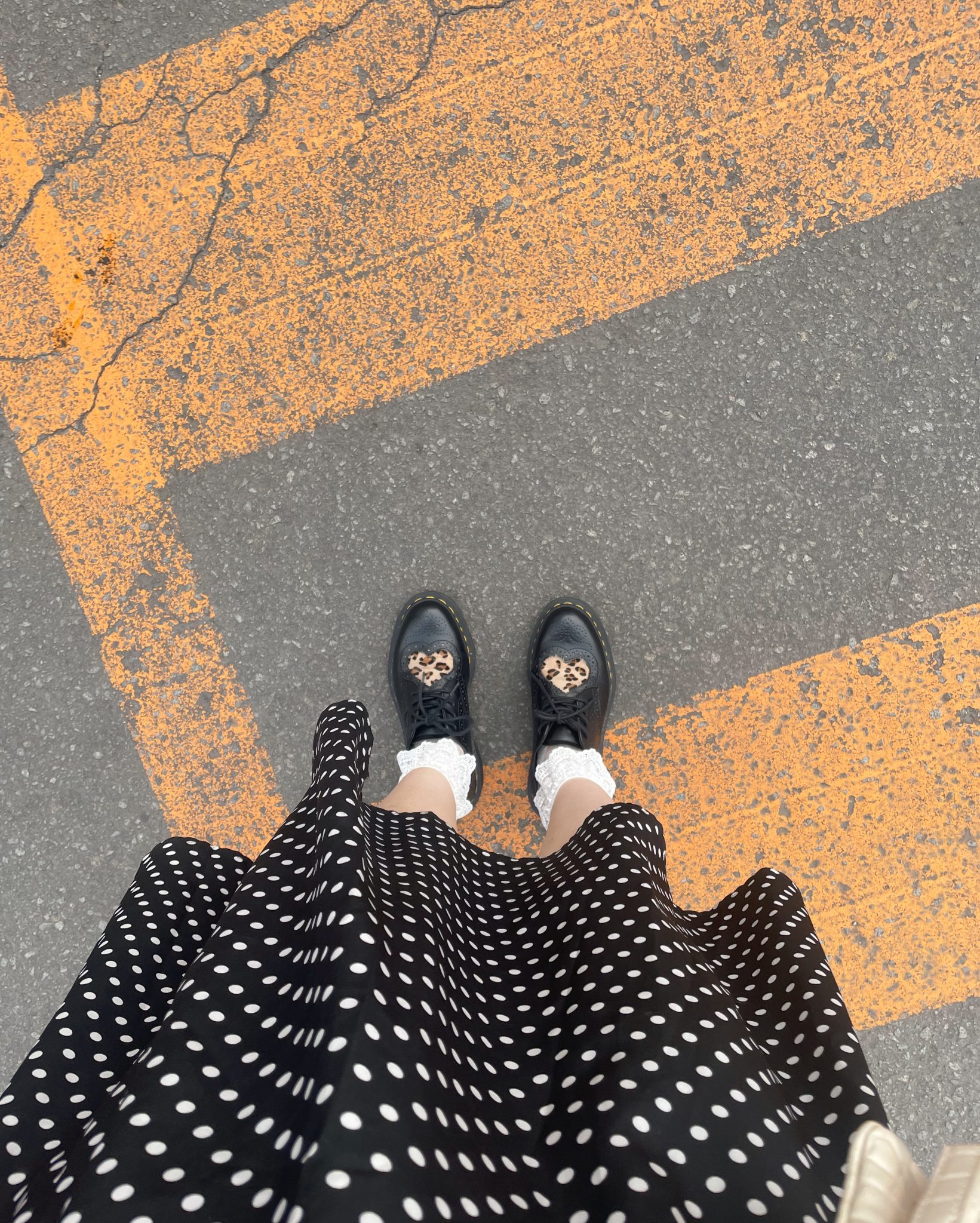 ドットのスカートに合わせてホワイトのバッグとソックス