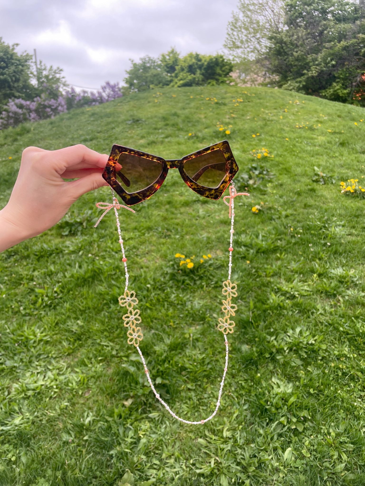 メガネをかけると顔の横にリボンがくるようになっているデザインです ୨୧