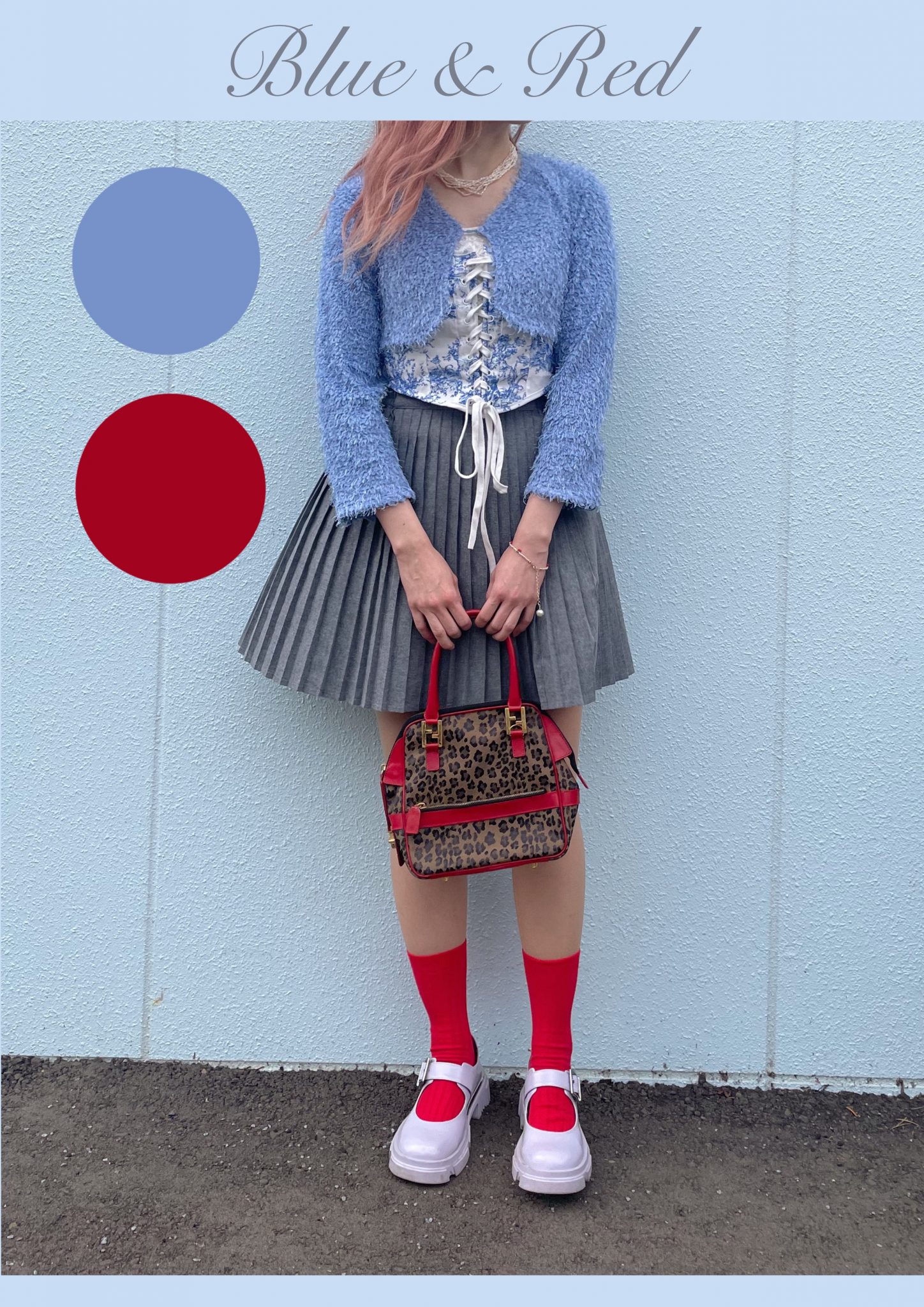 トワルドジュイのトップスとカーディガンの水色に小物で赤を入れてみたよ