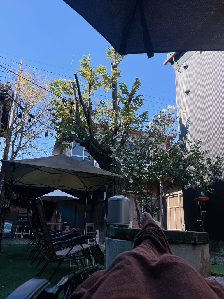 中庭にあるシンボルとなる大きな栗の木の下でインフィニティチェアでゆっくりと。。