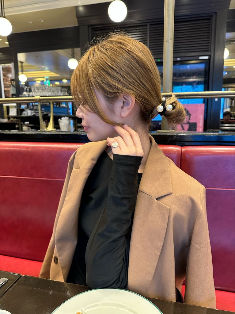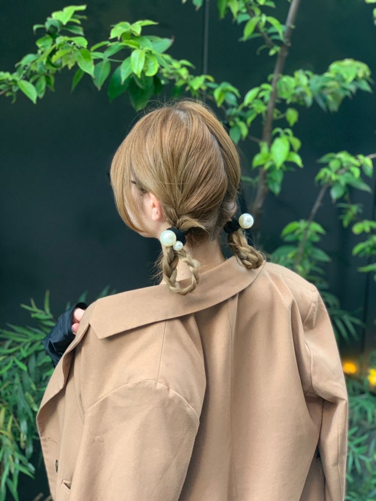ひとつにまとめて、パール付きのヘアゴムでポイントになるように♡