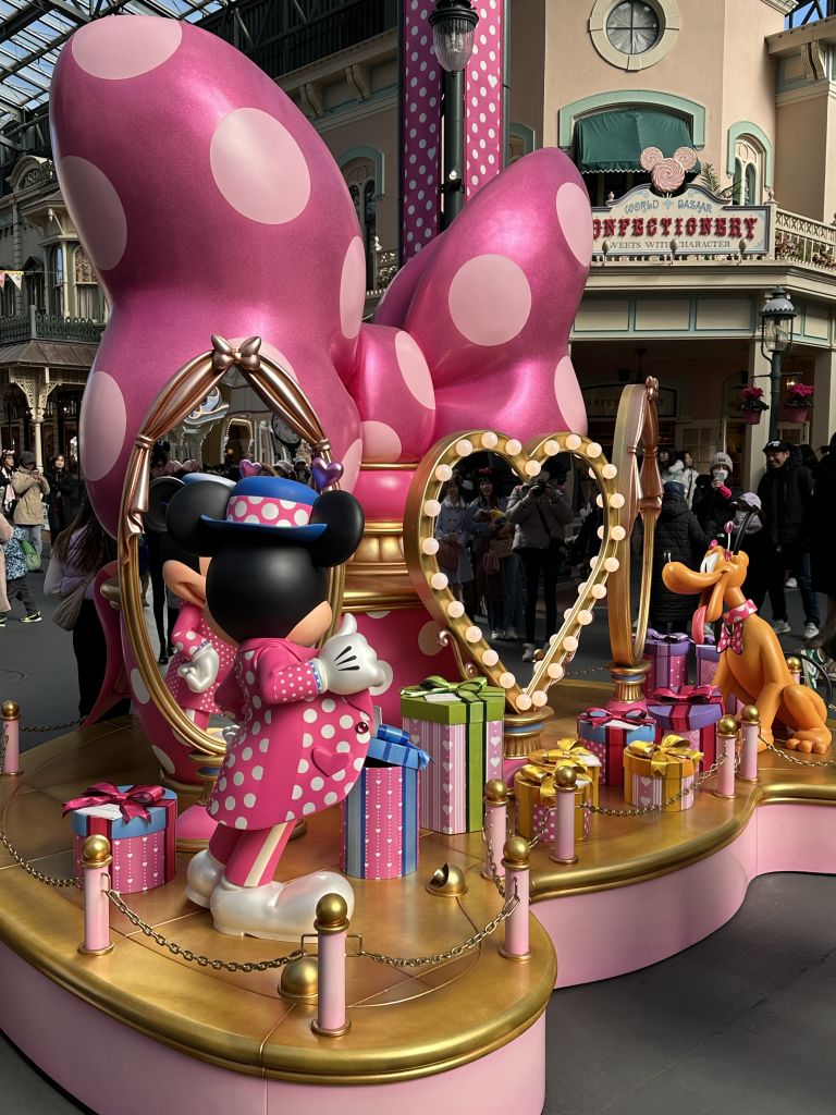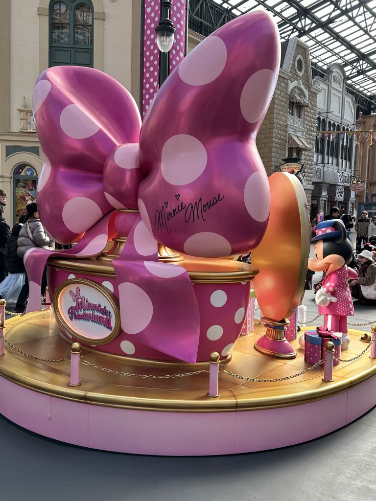 パークのゲート入ってすぐにミニーちゃんを描く花壇があって、進んでいくとリボンのかわいいモニュメントが♡