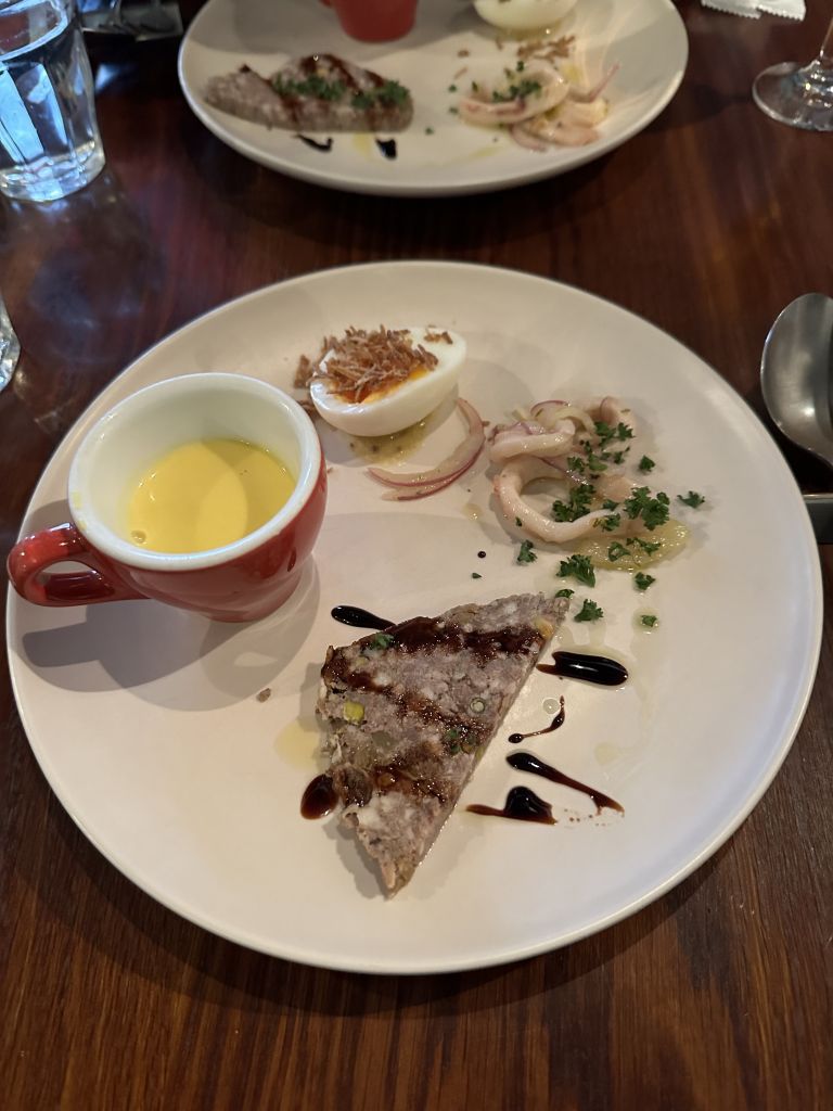 ラザニアの前にはサラダと前菜4種類、カラスミのパスタが。とても豪華。