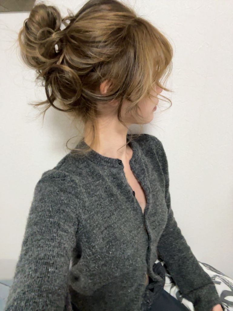 26mmのコテでくるっくるに巻いてざっくりゆるりとひとつにまとめてこんな感じ♡