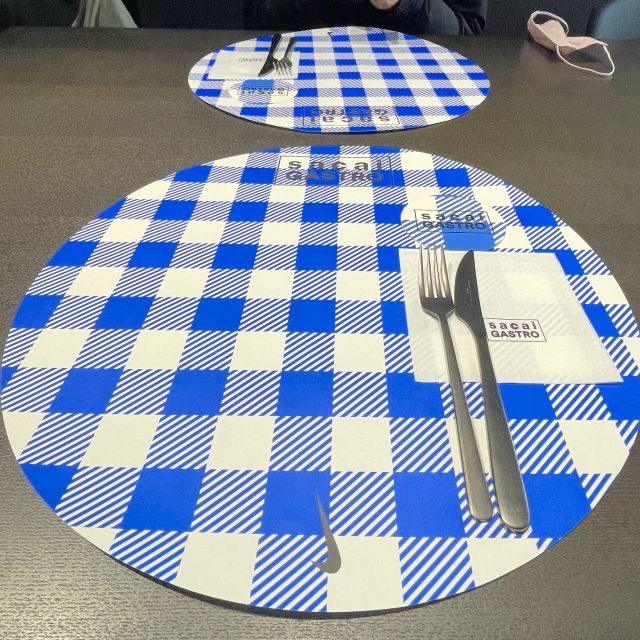 メニュー表や、クロス、コースターなどがブルー×ホワイトのチェッカーを基調としていて可愛いです