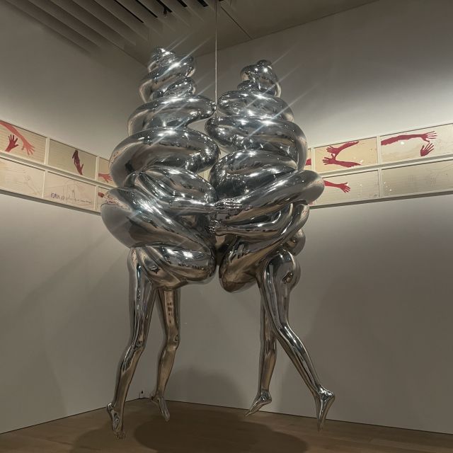ふたつの身体が抱き合うような姿勢で不安定に吊るされた銀色の彫刻