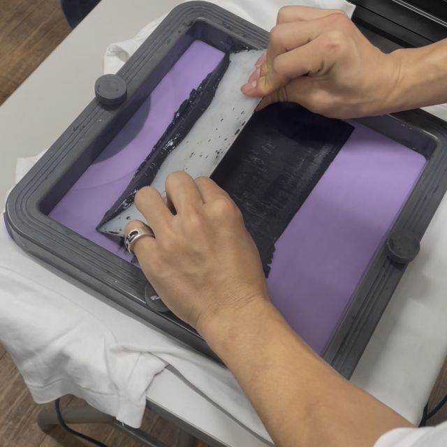 K100%でデータを作成して印刷をしたら、Tシャツくんの専用の紫外線を当てる機械にセットして、版を作ったらインクを乗せて刷るだけ!