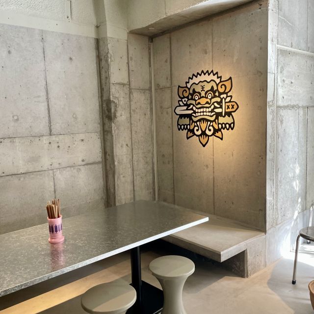 コンクリート打ちっぱなしの店内で、壁に飾られている虎や、ピンクや水色の箸立てが可愛いです