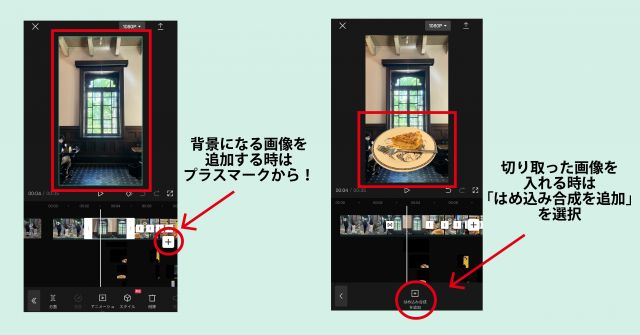 切り取った背景透過画像を追加する時は「はめ込み合成を追加」から