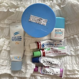 まず肌に弱めの塗り薬、ヒルドイドを塗布します。アトピー肌の方には必須ですね。
