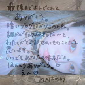 2. 最近はなにをするにも、どこにいても、眠りにつくその一瞬まで、まっくろで重くてこわ〜い何かがのし掛かってきて恐ろしくて不安でいっぱいの日々なんだけどね、これ読んで、ちょっぴりだけど、でも確かに生きるパワーみたいなものをもらえた気がします。ひなの想い届いています。ラヴ♡