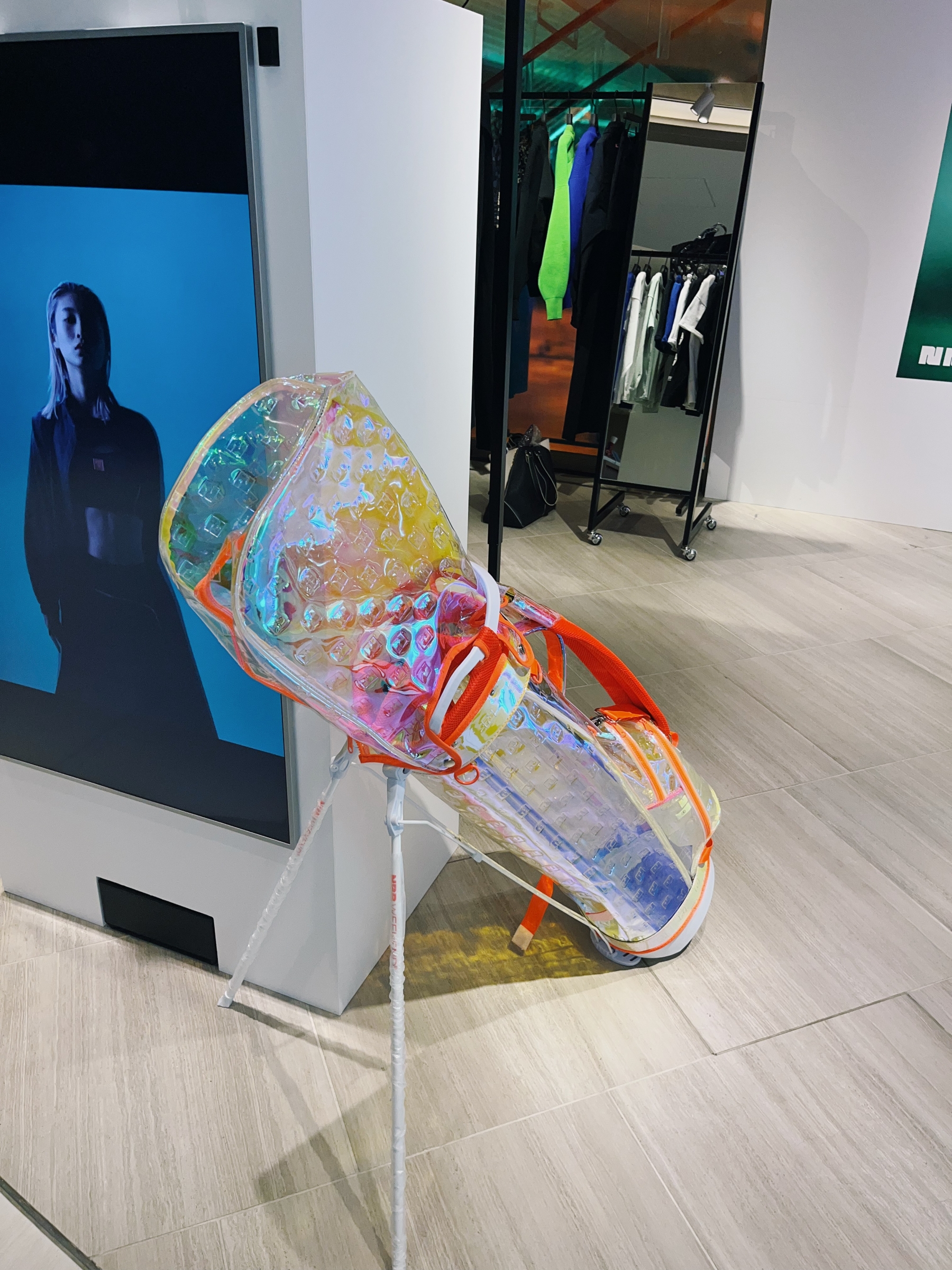 店頭には、クリアのゴルフバッグが!!お洒落すぎて、ゴルフバッグか?!と疑うほど。差し色のオレンジベルトが素敵です。