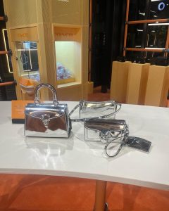店内では、アイコニックなメタリックのバッグや