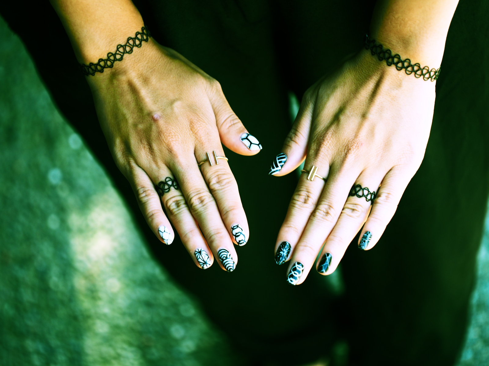 Tatto chokerとゴールドのアクセサリーをMIXして