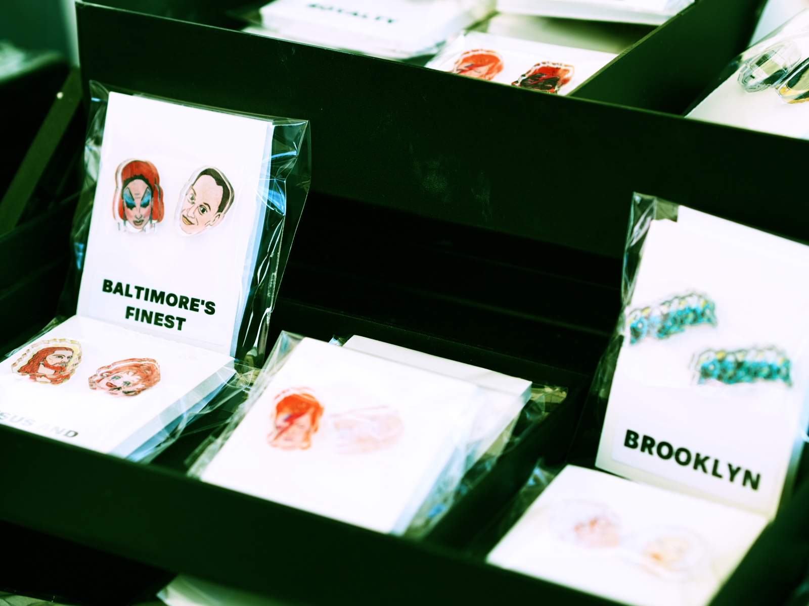 アクリルに書いたアーティストの絵がピアスやリング、ネックレスになっていて
