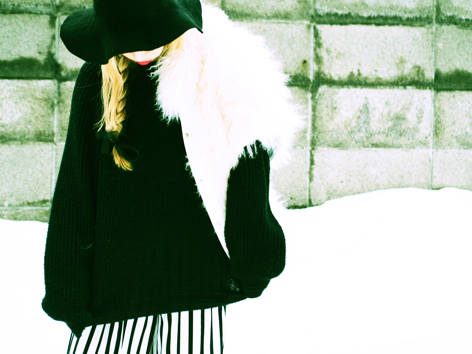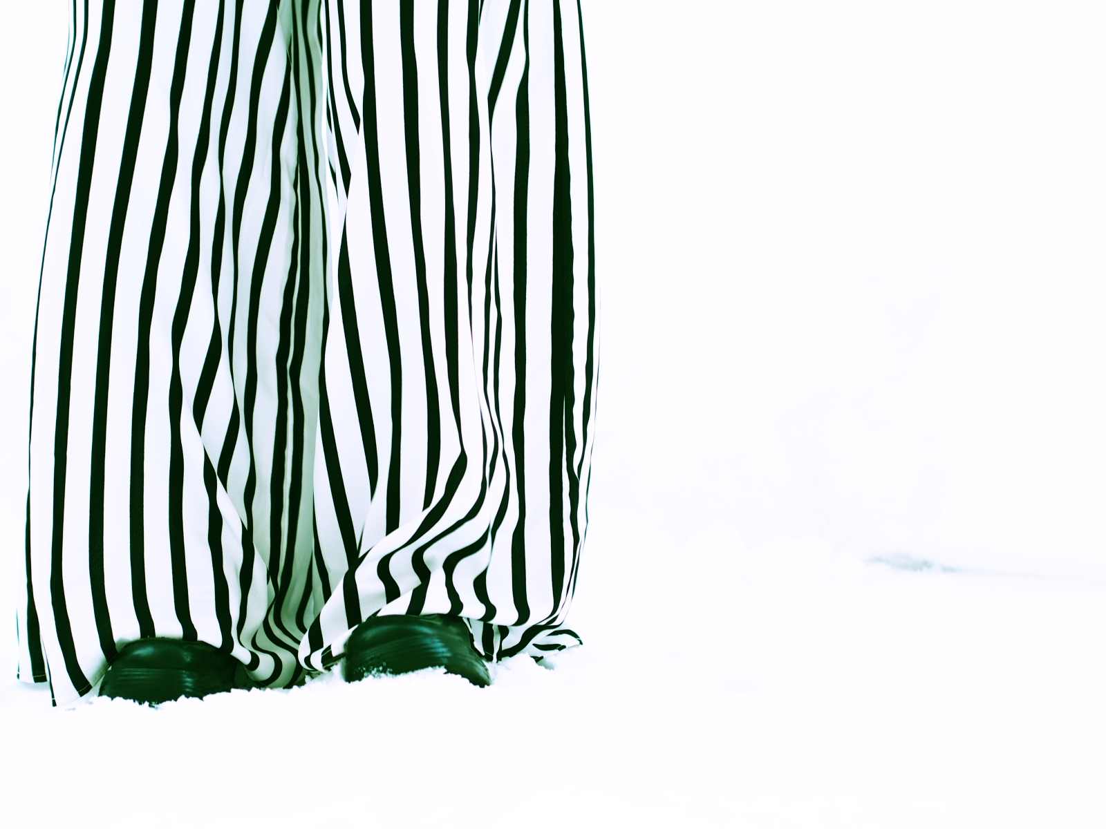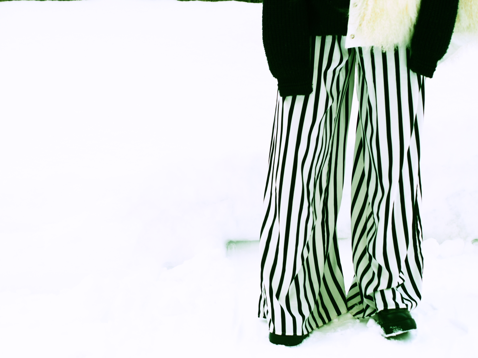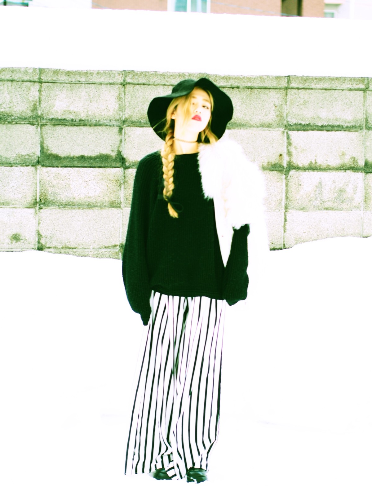 ストライプのワイドパンツの上にはシンプルに黒ニットを