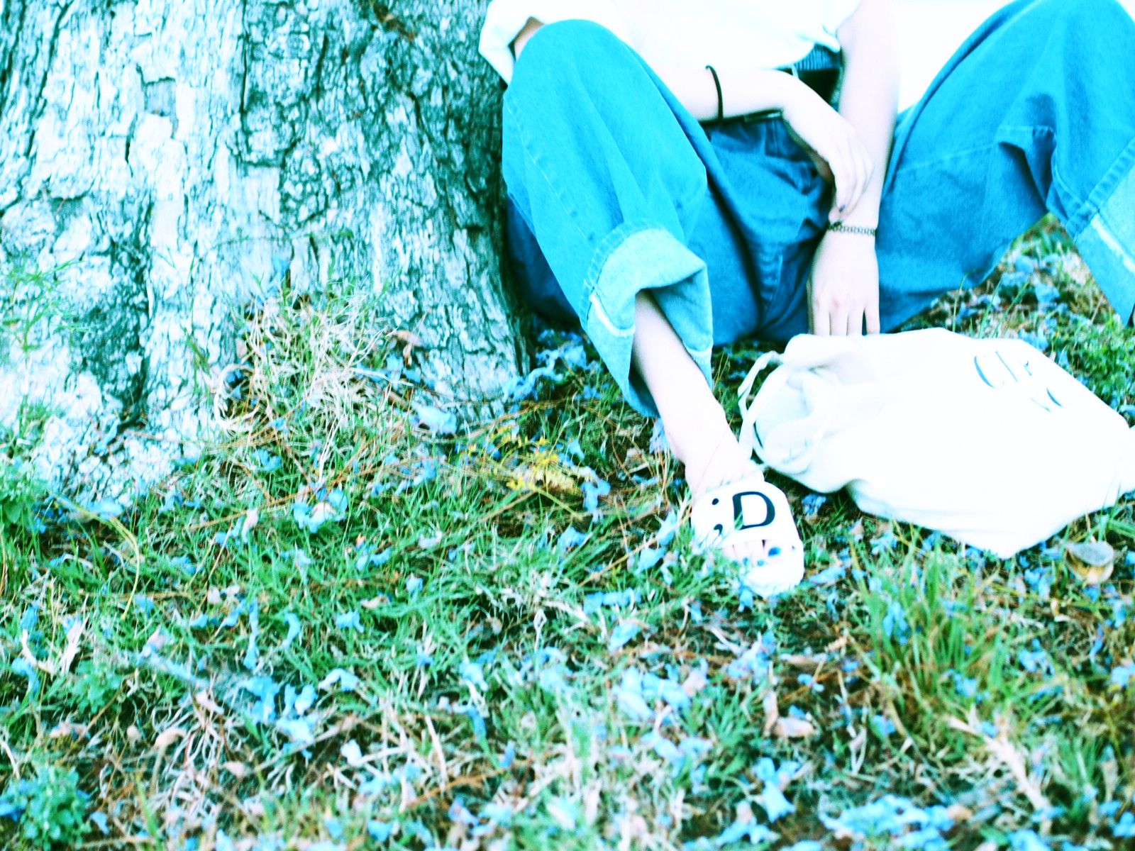 【極太デニムにシンプルTの究極スタイル。絵文字サンダルをポイントに!】
