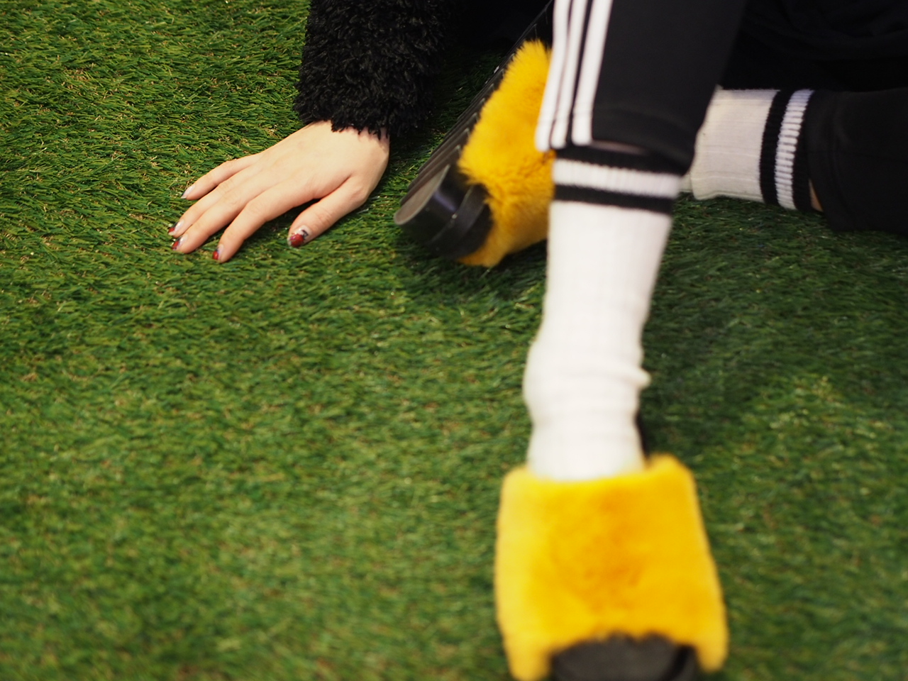 春らしくイエローのファーサンダルを差し色にして