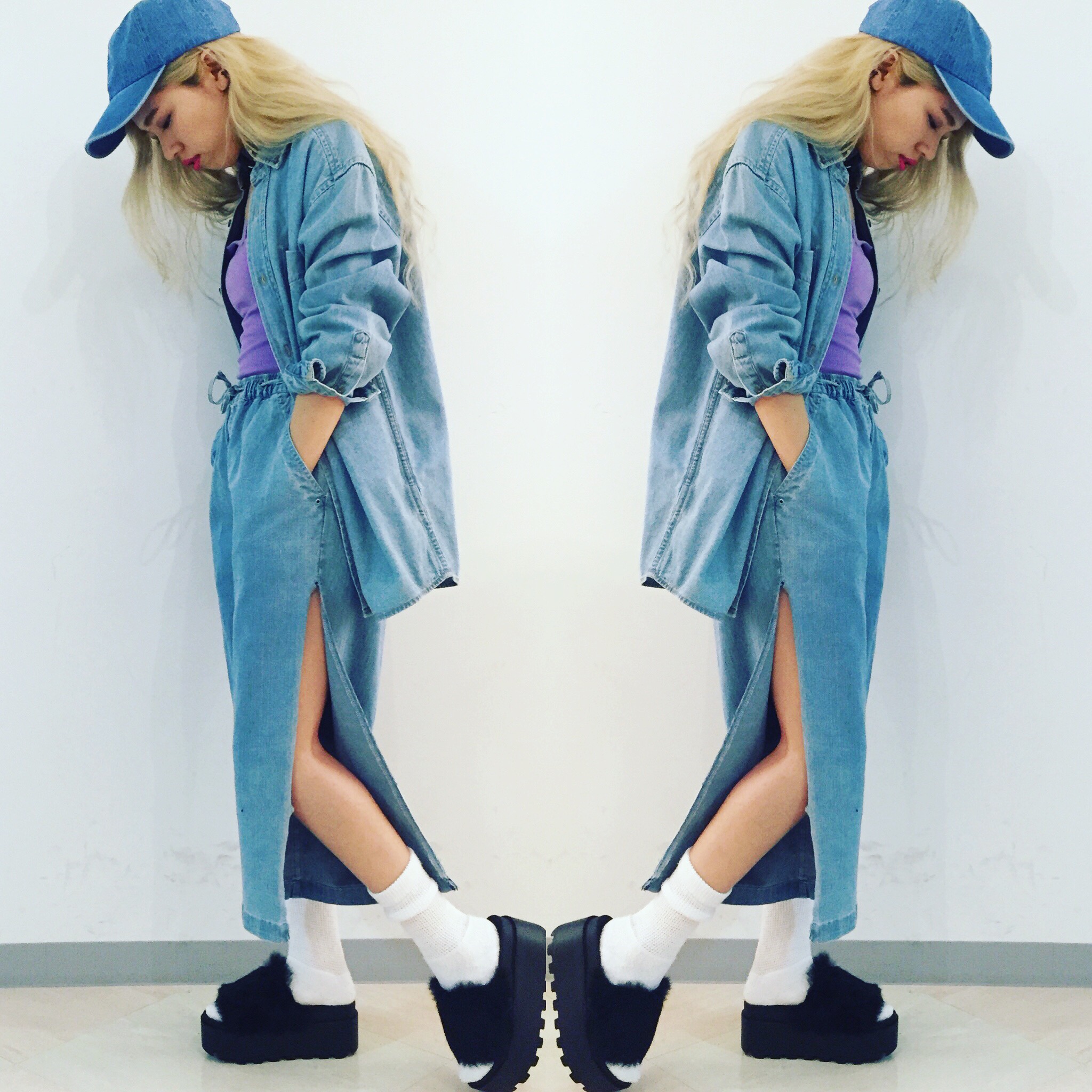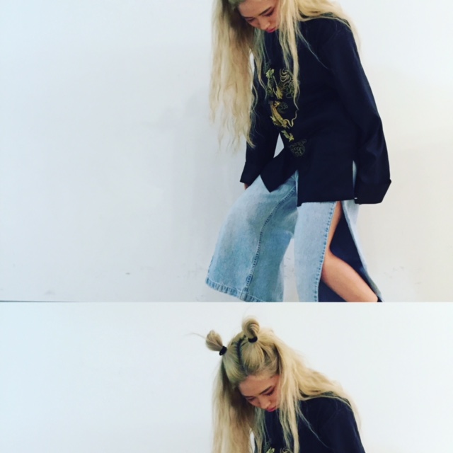 こちらも別のスリットデニムをチャイナシャツに合わせました