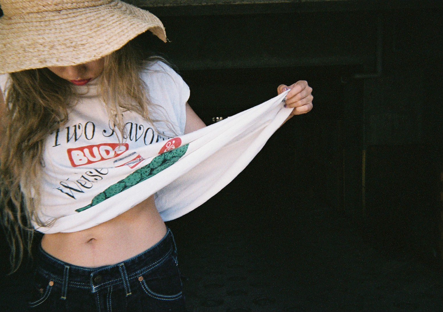 タンクトップや開襟シャツの裾をきゅっと縛ったスタイルに