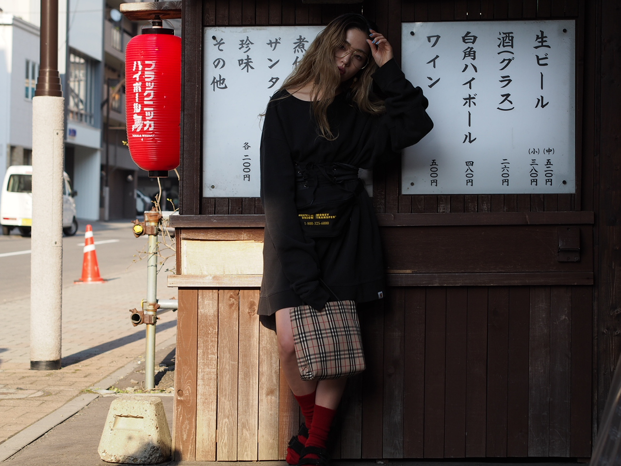 オーバーサイズのデニムなどにベルト代わりにウエストポーチをして