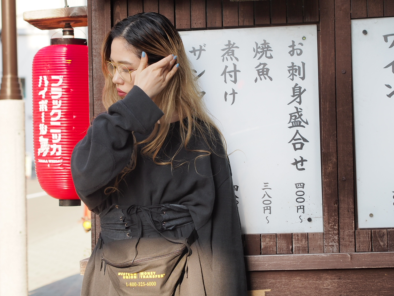 コルセットベルトの上にさらにウエストポーチ。