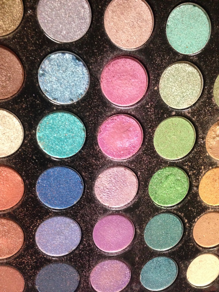 中心から目尻に向けて、下のカラーパレットのピンクとパープルの列を適当に混ぜたシャドーを眉毛のしっぽまでつり上げるようなイメージでぼかしながら重ねたよ。