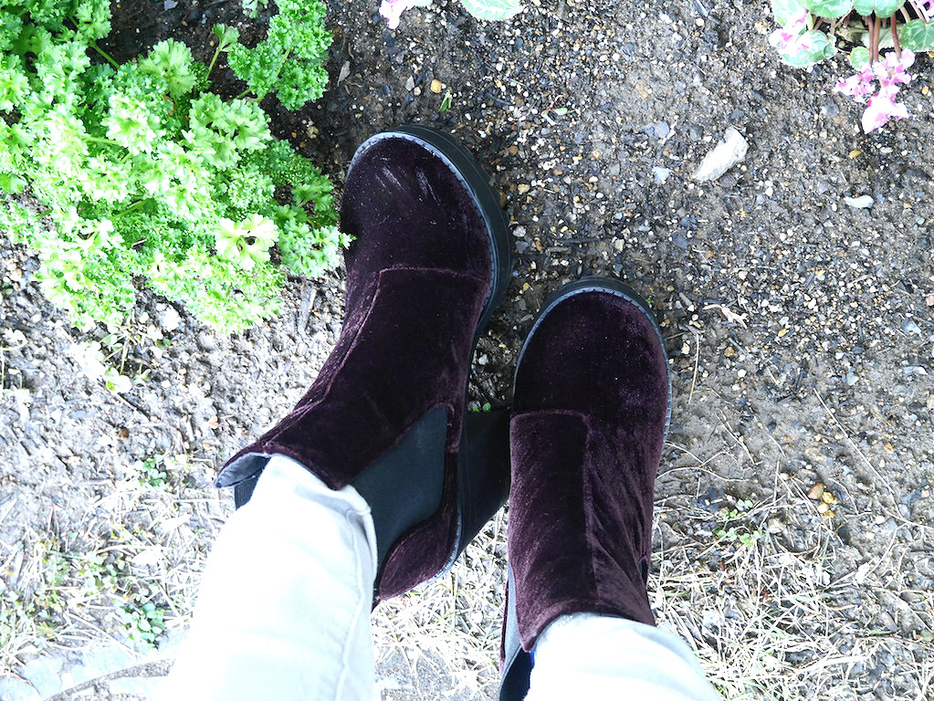 靴はH&Mで購入したフェイクベロアのブーティー。